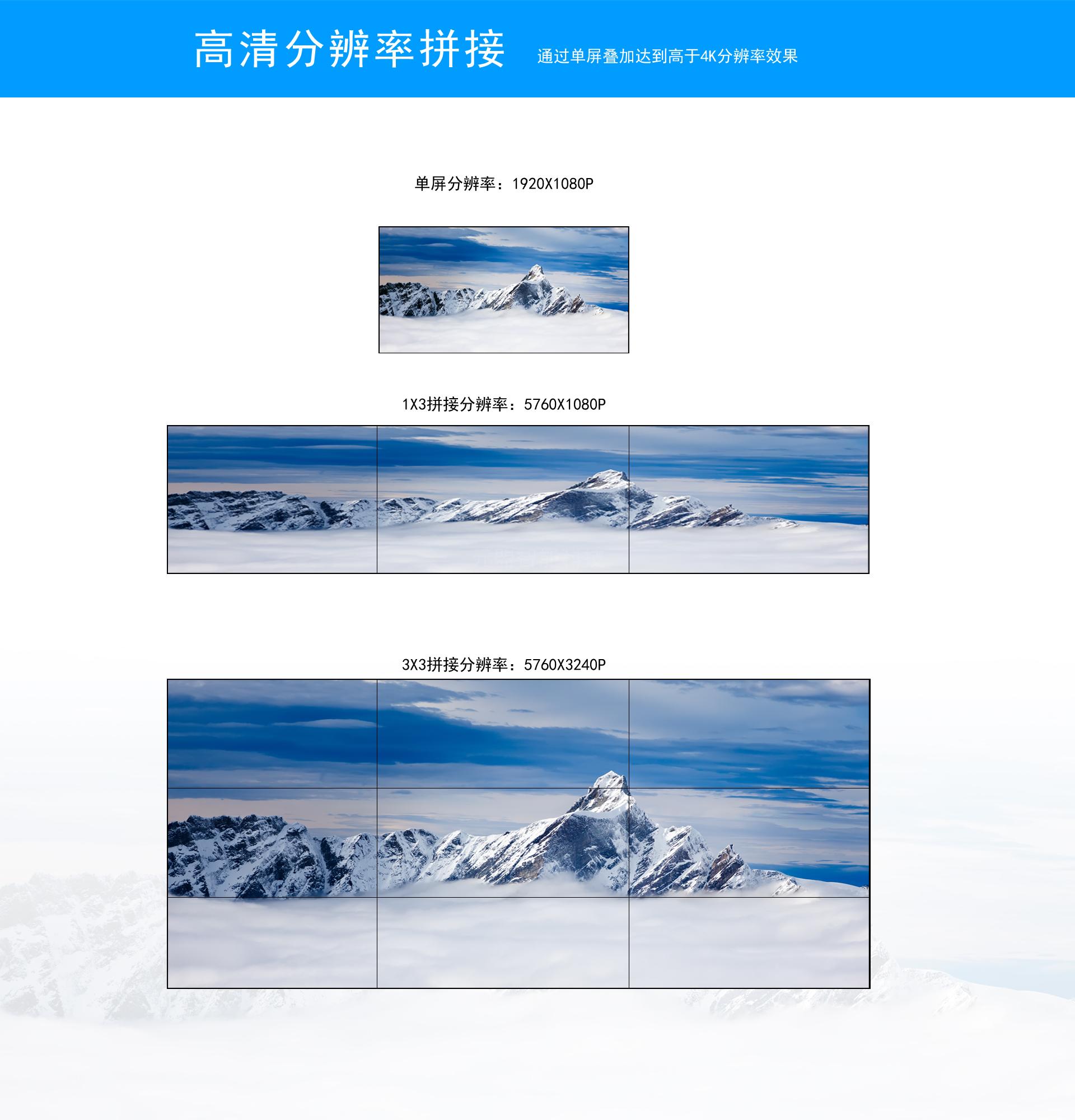 超窄邊液晶拼接單元采用三星面板,背光色彩還原度好,圖像逼真,點狀超密集分布,背光亮度均勻。采用高裕量的電子元器件,獨有智能色彩校正技術,令色彩更加亮麗自然。采用UV2A液晶晶體排布技術:亮場明亮、節能、超高光能效、暗場無漏光.超高對比度6ms響應速度,圖像更流暢。具有節能、無輻射,壽命長,長期使用亮度均勻,背光采用無玻璃材料、安全運輸、面板外殼裝材料堅固,不易破損。液晶顯示單元采用背光技術,極大提升了拼接單元的整體顯示效果,具有突出的技術特點。