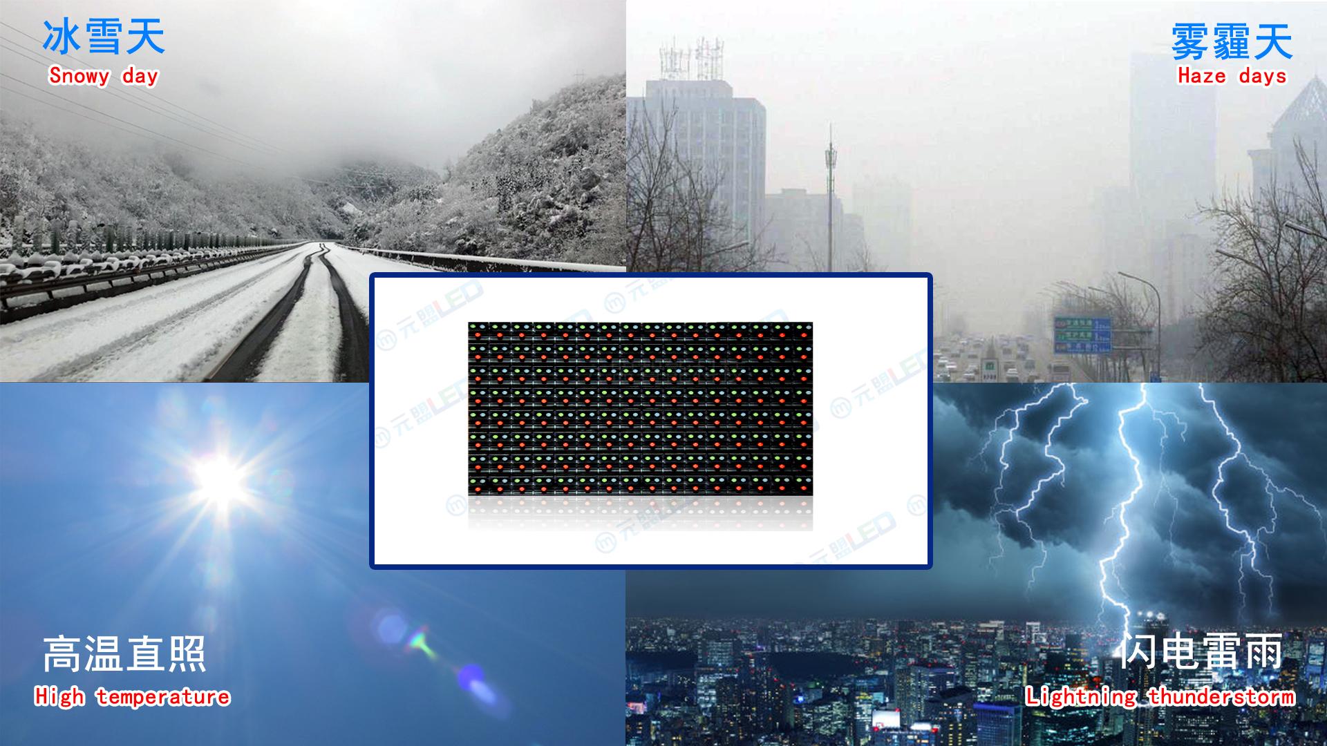 ? ? ?屏體可在腐蝕和高溫嚴酷環境下使用數年之久,在公路上,最高使用溫度可達70度以上,LED燈使用的扛紫外線環氧樹脂封裝,這種封裝可抵擋太陽光直射,另外屏體具體防水、防腐蝕、防雷電、防靜電、防風、防曬、防熱、防凍等功能。